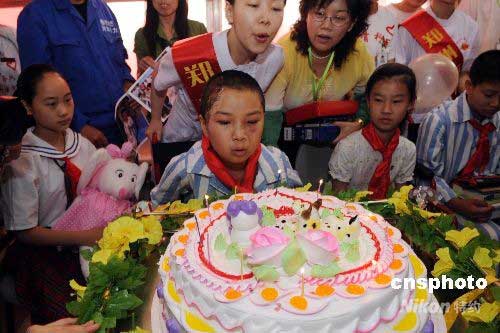 5月29日,來(lái)自四川青川縣喬莊鎮(zhèn)的李新婷在鄭州骨科醫(yī)院病房?jī)?nèi)過(guò)十一歲生日,醫(yī)護(hù)人員、熱心市民為這位來(lái)自四川災(zāi)區(qū)的小傷員送上了生日蛋糕、小書包等禮物。中新社發(fā) 李志全 攝