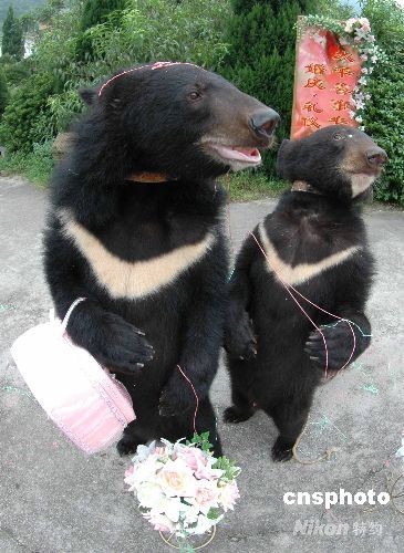9月4日上午,浙江省溫嶺動物園為發(fā)育成熟的兩只猴子和兩只狗熊,策劃兩場特殊的“婚禮”。所謂“悟空”夫妻,“新郎”名叫悟空,“新娘”名叫小丫;“狗熊”夫妻,“新郎”名叫大黑,“新娘”名叫二蘭。中新社發(fā) 江勇兵 攝