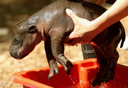 “莫尼法”的雌性侏儒河馬被人從浴盆里拿出來。
