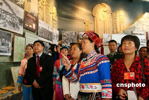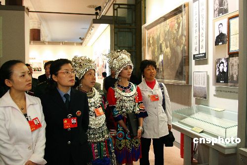 10月19日,參加中共十七大會議的湖南省代表身著傳統(tǒng)苗族服飾,在軍事博物館參觀《復(fù)興之路》展覽。中新社發(fā) 富田 攝