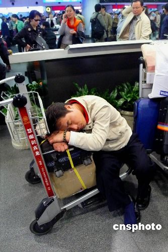十月二十六日,一位旅客在北京首都國(guó)際機(jī)場(chǎng)候機(jī)大廳睡著了。當(dāng)天,北京遭遇大霧天氣,北京氣象臺(tái)已發(fā)布大霧橙色預(yù)警信號(hào)。因能見(jiàn)度太低,交通受阻,航班延誤,大批旅客滯留機(jī)場(chǎng)。中新社發(fā) 王瑤 攝