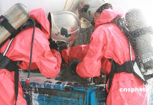 10月26日,蘇州工業(yè)園區(qū)舉行了一次針對道路運輸危險化學品事故應急救援實戰(zhàn)演練。該區(qū)公安、消防、衛(wèi)生、環(huán)保安監(jiān)等相關部門聯(lián)合參加了此次應急救援、快速反應和協(xié)調(diào)作戰(zhàn)等綜合演練。中新社發(fā) 蘇秀 攝