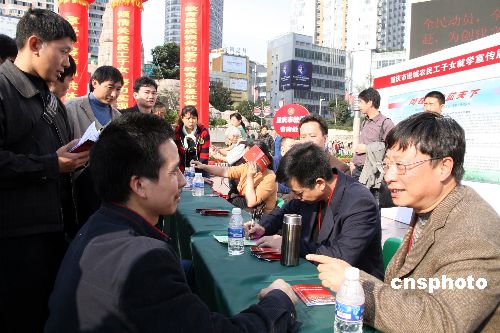 11月2日,重慶市教委為該市農(nóng)民工子女就學舉行大型咨詢活動,眾多當?shù)剡M城務工人員前來咨詢學校招生、轉學等問題。據(jù)悉,此次咨詢活動是該市政府為迎接首個“重慶農(nóng)民工日”舉行的系列活動之一。中新社發(fā) 郭晉嘉 攝