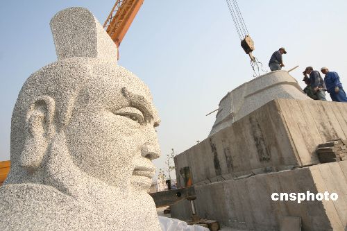 11月6日,由北京運抵許昌魏武帝廣場的曹操雕像開始組裝安放。這座曹操像高度6.95米,像身重量近200噸,底部積座的長度和寬度均為5米,通身采用耐風化、不變色的花崗巖雕刻而成,半月左右可全部安裝完畢。據(jù)了解,該座雕像由中央美院雕塑系教授段?档葘<医(jīng)數(shù)次設(shè)計,歷經(jīng)多個環(huán)節(jié)最終完成。中新社發(fā) 牛書培 攝