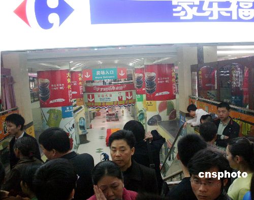 11月10日上午8時20分左右,重慶沙坪壩區(qū)家樂福商場內,發(fā)生一起因爭搶特價食用油造成的踩踏傷亡事故。目前已致3人死亡31人受傷,其中7人傷勢嚴重。圖為事故發(fā)生后,該超市隨即暫停營業(yè),超市門口聚集大批當地市民。中新社發(fā) 郭晉嘉 攝