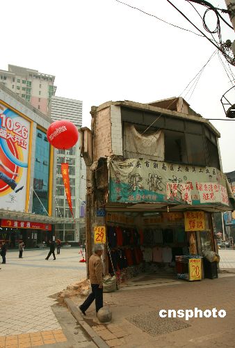 11月13日,在長沙人流如潮的黃金地段南門口,一家商廈廣場上挺立著一座陳舊的房子。據(jù)了解,從2005年項(xiàng)目啟動拆遷到現(xiàn)在,這個(gè)“釘子戶”已經(jīng)堅(jiān)持了近三年。中新社發(fā) 趙晶 攝
