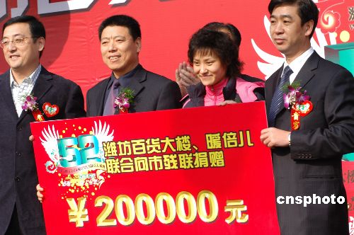 11月21日,奧運(yùn)冠軍高敏在山東濰坊參加大型愛心捐贈儀式。當(dāng)日,濰坊百貨大樓與中韓合資暖倍兒服飾有限公司向該市殘疾人聯(lián)合會捐贈價(jià)值20萬元的保暖內(nèi)衣。中新社發(fā) 王志德 攝