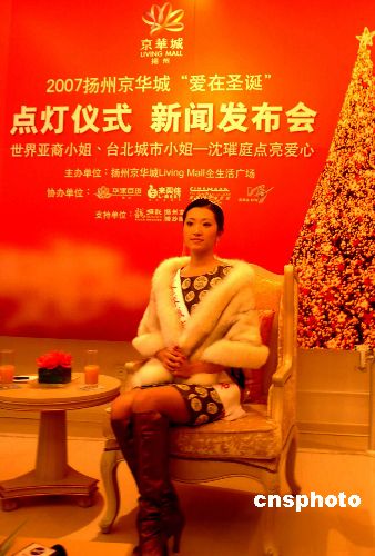 11月30日,揚(yáng)州舉辦“愛在圣誕”點燈儀式及中國麥田計劃獻(xiàn)愛心新聞發(fā)布會。世界亞裔小姐、臺北城市小姐沈璀庭出席,并將于12月1日晚在揚(yáng)州京華城廣場為21米高的巨型圣誕樹啟動“愛在圣誕”點燈儀式,并與“中國麥田計劃”愛心慈善團(tuán)體攜手獻(xiàn)愛心!爸袊溙镉媱潯庇2005年成立,是一個為貧困地區(qū)兒童建立圖書室、捐贈衣物及創(chuàng)造讀書機(jī)會的民間志愿組織。中新社發(fā) 崔佳明 攝