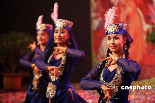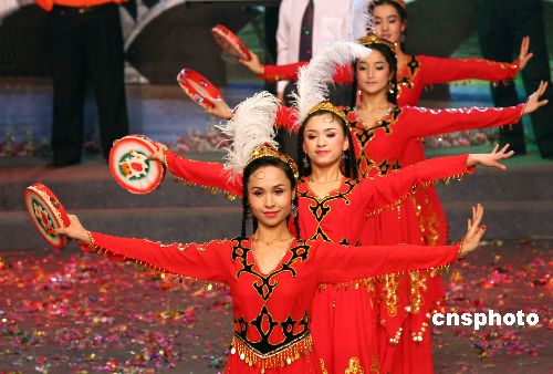 12月11日下午,新疆伊犁哈薩克自治州舉辦了歡慶2007年古爾邦節(jié)文藝晚會,演員們通過舞蹈、歌曲、小品等多種形式,展示了穆斯林群眾喜慶歡樂的節(jié)日氣氛和團結(jié)奮進、昂揚向上的精神風(fēng)貌。2007年12月20日是穆斯林群眾的傳統(tǒng)節(jié)日古爾邦節(jié)。中新社發(fā) 劉成剛 攝