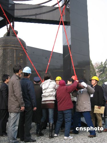 十二月十三日十時(shí),江蘇省各界人士八千多人在新落成的侵華日軍南京大屠殺遇難同胞紀(jì)念館新館前的和平廣場(chǎng)隆重舉行“悼念侵華日軍南京大屠殺三十萬同胞遇難七十周年暨侵華日軍南京大屠殺遇難同胞紀(jì)念館擴(kuò)建工程竣工儀式”。南京大屠殺幸存者代表、青少年代表、擴(kuò)建工程建設(shè)者代表放飛和平鴿,并撞響了“和平大鐘”。中新社發(fā) 朱曉穎 攝