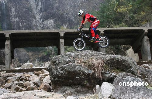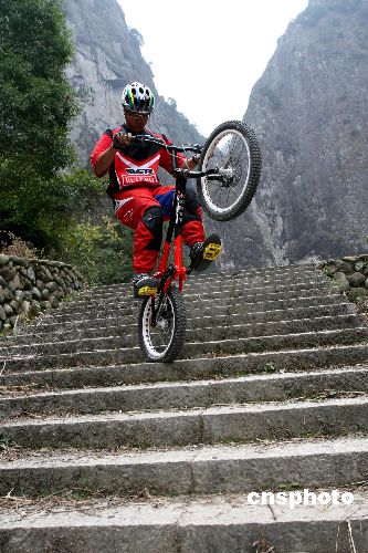 12月18日,創(chuàng)造了自行車(chē)攀登高樓吉尼斯世界新紀(jì)錄的“溫州小子”張金成,為即將舉行的“金茂巔峰對(duì)決 攜手共迎奧運(yùn)——2008金茂大廈國(guó)際自行車(chē)攀樓挑戰(zhàn)賽”進(jìn)行各式各樣的體能及技巧訓(xùn)練。此次挑戰(zhàn)張金成的是來(lái)自哥倫比亞運(yùn)動(dòng)員加維爾·薩帕塔、安道爾運(yùn)動(dòng)員夏維·卡薩斯,張金成對(duì)即將到來(lái)的“巔峰對(duì)決”感言:“目前最要緊的是心態(tài)要調(diào)整好,2008一定成功!”中新社發(fā) 陳昌其 攝