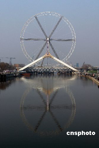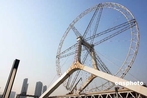 12月18日,天津海河永樂橋(原名慈海橋)上的“摩天輪”正式合龍。俗稱“天津之眼”的“摩天輪”直徑為110米,共有48個透明座艙,每個座艙最多可坐8人,可同時供380余人觀光,勻速轉(zhuǎn)動一圈大約需要30分鐘。中新社發(fā) 李勝利 攝