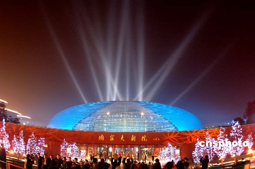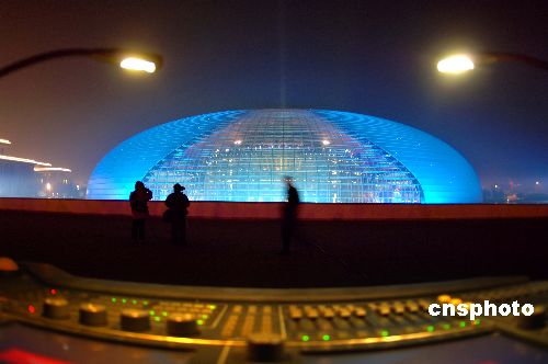 12月20日,北京國家大劇院測(cè)試首個(gè)演出季的外部燈光效果,藍(lán)色的燈光和背后高功率射燈將國家大劇院裝扮得夢(mèng)幻迷人。據(jù)悉,本次開幕國際演出季將從2007年12月22日持續(xù)到2008年4月6日,期間將有78個(gè)劇目、180場(chǎng)精彩演出在這里隆重上演,其中三分之一為國外劇目,涵蓋了歌劇、舞劇、音樂會(huì)、話劇、民族戲曲五大藝術(shù)門類,預(yù)計(jì)接納觀眾30萬人次。中新社發(fā) 廖攀 攝