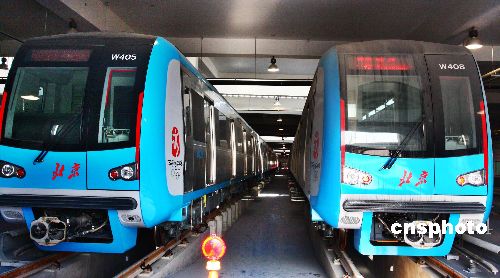 1月2日,北京地鐵10號(hào)線萬(wàn)柳車輛段,工作人員對(duì)首批地鐵車輛進(jìn)行檢測(cè)調(diào)試工作。據(jù)悉,北京地鐵10號(hào)線一期(含奧運(yùn)支線)全線軌道具備行車條件后,首批車輛和地鐵運(yùn)營(yíng)公司已進(jìn)駐該車輛段,今年2月將開始空載試運(yùn)行,6月載客試運(yùn)行。首批車輛的車頭為藍(lán)色,并刷有紅色的中國(guó)印標(biāo)識(shí),車體為不銹鋼本色,車內(nèi)白色座椅、紅色扶手和拉環(huán),車門有扶手。中新社發(fā) 鄭雄增 攝