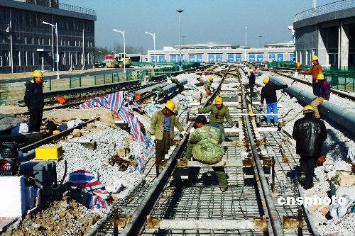 北京地鐵10號(hào)線萬(wàn)柳車輛段,工作人員在加緊軌道工程建設(shè),并對(duì)首批車輛進(jìn)行檢測(cè)調(diào)試工作。