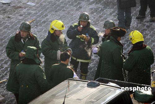 圖為已奮戰(zhàn)十七個小時的消防官兵抽空輪流進(jìn)食,補(bǔ)充體力。