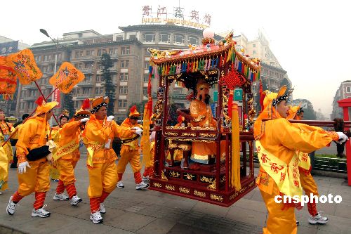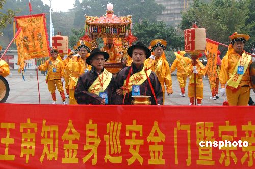 一月九日上午,閩王王審知金身在七十余位福州王氏宗親文化交流訪問團(tuán)成員護(hù)送下,在廈門上船經(jīng)“廈金”航線直航金門巡安,進(jìn)行為期四天的交流活動。這是閩王金身首次赴金門巡安,期間福州與金門兩地王氏宗親將共同進(jìn)行祭祖、學(xué)術(shù)交流等活動。中新社發(fā) 王東明 攝