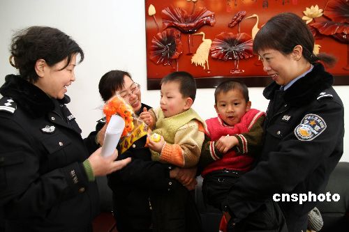 1月10日,沈陽市公安局社區(qū)警務(wù)支隊(duì)民警到市兒童福利院為無戶口的31名棄嬰解決戶口問題,并送去落戶手續(xù)。社區(qū)警務(wù)支隊(duì)的民警還為孩子們送去了精心選購(gòu)的各種禮物。這些被遺棄的孤兒,多數(shù)無法查找到他們的身源,沒有戶口就如沒有一個(gè)合法的公民身份。為了不影響這些孩子今后的成長(zhǎng)、生活、學(xué)習(xí)、就業(yè)。沈陽市公安局社區(qū)警務(wù)支隊(duì)采取特事特辦的方式,解決棄嬰們的后顧之憂。到目前為止已為263名棄嬰辦理了落戶。中新社發(fā) 黃金昆 攝
