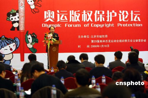 一月十六日,由北京市版權(quán)局、北京奧組委共同組織的“奧運(yùn)版權(quán)保護(hù)論壇”在北京舉行。這是新年伊始,由政府管理部門組織的第一個以奧運(yùn)版權(quán)保護(hù)為主題的大型宣傳活動。中新社發(fā) 任海霞 攝