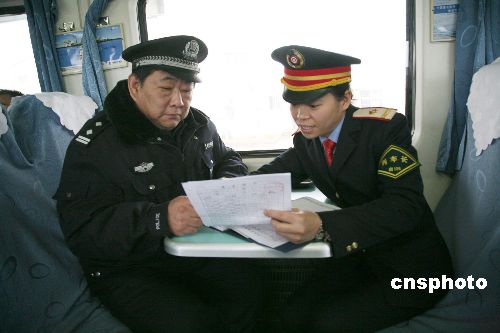 圖為南昌鐵路局N527/N528次列車列車長王水英與乘警長陳曉波十六日在行駛的列車上抓緊研究春運(yùn)治安方案。