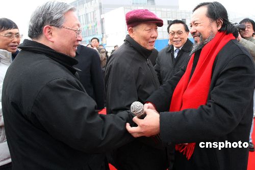 圖為全國(guó)人大副委員長(zhǎng)、中國(guó)科學(xué)院院長(zhǎng)路甬祥與雕塑藝術(shù)家遙遠(yuǎn)雕塑(右)先生握手表示祝賀。