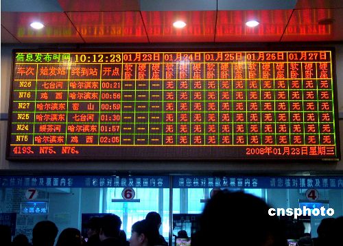 1月23日,黑龍江牡丹江2008年春運(yùn)工作正式啟動(dòng)。黑龍江省境內(nèi)途經(jīng)牡丹江的部分短途列車,出現(xiàn)10天內(nèi)無(wú)票可售的局面。中新社發(fā) 莊文斌 攝