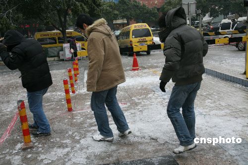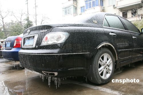 一月二十六日,江西四十二個(gè)縣市出現(xiàn)凍雨,是該省近二十年來(lái)遭遇的最嚴(yán)重凍雨(雨滴與地面或地物等接觸即凍結(jié)的雨)天氣。由于持續(xù)嚴(yán)寒,整個(gè)江西省儼然一個(gè)諾大的“滑冰場(chǎng)”,滿(mǎn)街跑的盡是“凍車(chē)族”。中新社發(fā) 吳慶才 攝