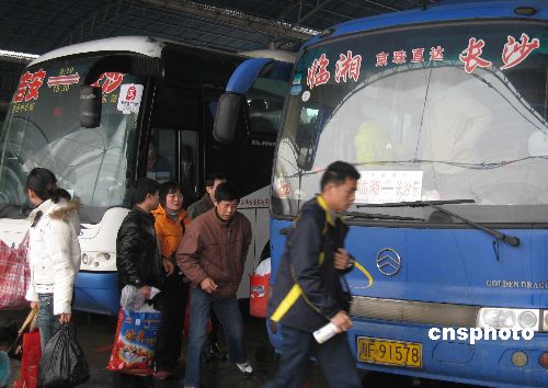 1月31日,湖南長(zhǎng)沙汽車(chē)東站班車(chē)已經(jīng)開(kāi)通,人們急切的上車(chē)回家。隨著冰凍的輕微緩解以及相關(guān)部門(mén)的奮力除冰,湖南部分高速公路和國(guó)道恢復(fù)通行,長(zhǎng)沙汽車(chē)東、西、南三站的大部分客運(yùn)班車(chē)隨之恢復(fù)營(yíng)運(yùn)。中新社發(fā) 劉雙雙 攝