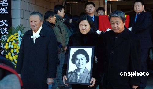 圖為遺體告別儀式后,章含之女兒洪晃(右)手捧母親遺像踏上靈車為母親送行。