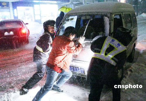2月1日晚,交巡警在推動一輛陷于雪堆中的汽車。江蘇宜興市再次遭受暴雪襲擊,宜興市公安交巡警大隊的眾多交巡警冒雪到交通要道指揮交通,為群眾排憂解難。中新社發(fā) 丁煥新 攝