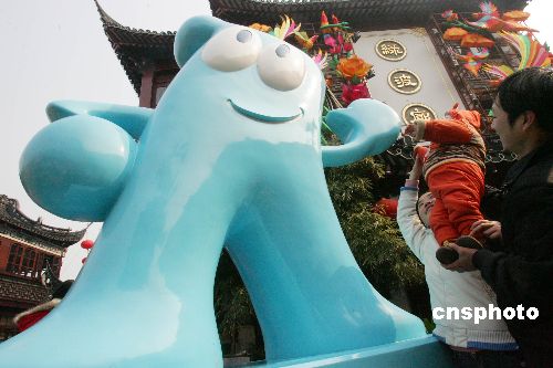 2月4日,2010世博會(huì)吉祥物“海寶”首座雕塑亮相申城,吸引了眾多市民的目光。該座雕塑由玻璃鋼材質(zhì)制成,高3.5米,寬2.3米。中新社發(fā) 湯彥俊 攝