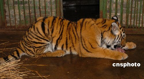 2月4日,在南昌動物園,華南虎“明明”正津津有味吃著飼養(yǎng)員送來的新鮮豬肉!懊髅鳌(原名華華)出生于上海,其父是南昌動物園寄養(yǎng)在上海的雄性虎。它約半歲時運回南昌,與成年虎相比,這只小華南虎特別活潑好動,惹人喜愛。由于患有雙目先天性白內(nèi)障,小虎走路時經(jīng)常碰壁,并且總是憑嗅覺發(fā)現(xiàn)食物。1月27日,南昌大學(xué)二附院眼科專家為小華南虎成功實施國內(nèi)首例華南虎白內(nèi)障摘除術(shù)。經(jīng)過一個星期的術(shù)后恢復(fù),情況良好的小華南虎被送往籠舍重新恢復(fù)與游客見面。為紀念小華南虎獲得健康視覺,南昌動物園將華南虎“華華”更名為“明明”。中新社發(fā) 朱文標 攝