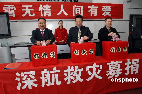 深圳航空公司二月四日發(fā)出緊急倡議,掀起“冰雪無情,人間有愛”賑災(zāi)捐款活動。當(dāng)日下午,僅半小時首批員工捐款已達二十余萬元人民幣。深航總裁李昆表示,我們的愛心行動將繼續(xù)開展下去,善款立即定向電匯貴州遵義、安順災(zāi)區(qū)。中新社發(fā) 陳文 攝