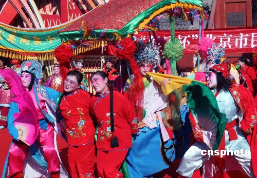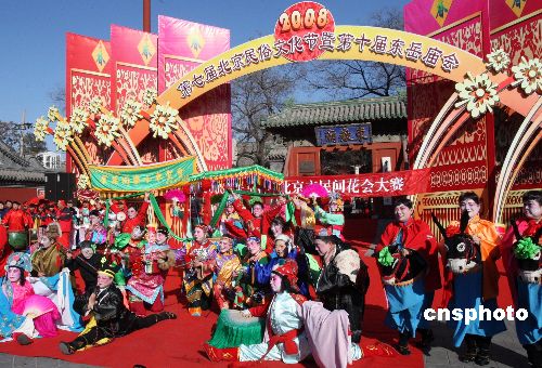 2月6日,“第七屆北京民俗文化節(jié)暨第十屆東岳廟春節(jié)文化廟會(huì)”在喜慶熱烈、歡樂祥和的氛圍中開鑼。東岳廟作為北京奧運(yùn)會(huì)主場(chǎng)館所在地朝陽(yáng)區(qū)唯一的民俗類專題博物館,是次廟會(huì)以“祈福納祥迎奧運(yùn)”為主題,活動(dòng)內(nèi)容精彩紛呈,既有傳統(tǒng)的非物質(zhì)文化遺產(chǎn)展示,亦有新增加的民俗活動(dòng)“請(qǐng)福牌”、“畫福布”、“請(qǐng)五!、“掛盤香”等活動(dòng)。同時(shí)“東岳杯”朝陽(yáng)區(qū)民間花會(huì)大賽的11個(gè)區(qū)縣、32檔花會(huì)也同臺(tái)競(jìng)技。中新社發(fā) 錢興強(qiáng) 攝
