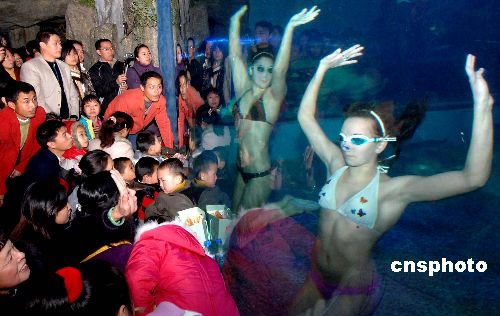 2月8日正月初二,來自俄羅斯遠(yuǎn)東奧林匹克中心水下芭蕾表演隊(duì)的俄羅斯姑娘在福州一海底世界表演精彩水下芭蕾,令前來觀看的福州觀眾陶醉。中新社發(fā) 劉可耕 攝