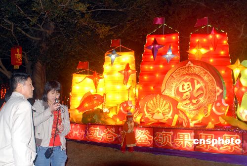 2008年2月7日晚,游人在“現(xiàn)代都市”燈前休閑觀賞。農(nóng)歷大年初一,眾多市民和游客到?谌f(wàn)綠園觀賞“華燈璀璨耀椰城”大型燈展。中新社發(fā) 善平 攝