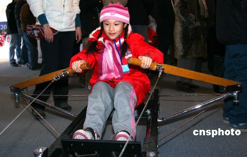 2月9日,農(nóng)歷大年初三,在龍?zhí)稄R會上可以免費體驗北京2008奧運會的28個體育項目,本屆龍?zhí)稄R會突出迎接北京奧運和非物質(zhì)文化遺產(chǎn)保護兩大主題。圖為在奧運體驗區(qū)內(nèi)小朋友正在體驗皮劃艇項目。中新社發(fā) 富田 攝