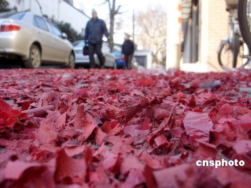 2月13日是正月初七,蘇州許多商家在節(jié)后營業(yè)第一天燃放“開門炮”,許多街道上一地紙屑。 中新社發(fā) 王建康 攝