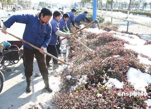 圖:宜興綠化工人清理積雪護苗木