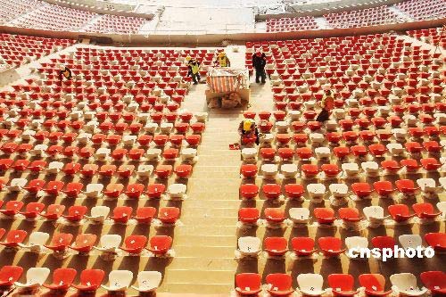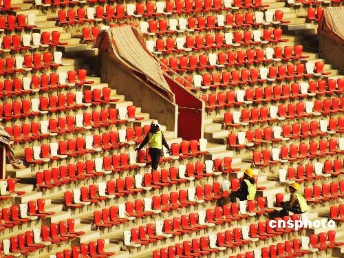 2月18日,工人們正在國(guó)家體育場(chǎng)“鳥(niǎo)巢”內(nèi)清潔座椅。北京2008年奧運(yùn)會(huì)主會(huì)場(chǎng)——國(guó)家體育場(chǎng)“鳥(niǎo)巢”8萬(wàn)個(gè)固定座椅已于1月底安裝完工,這意味著北京國(guó)家體育場(chǎng)“鳥(niǎo)巢”的建設(shè)工程已接近尾聲。中新社發(fā) 鄭雄增 攝