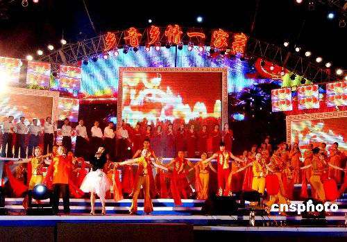 2月20日正月十四晚,前來參加“鄉(xiāng)音鄉(xiāng)情一家親”2008“兩馬同春鬧元宵”大型焰火文藝晚會(huì)演出的馬尾合唱團(tuán)、馬尾大頭娃娃表演隊(duì)與馬祖合唱團(tuán)、馬祖電音孩仔演出隊(duì)的成員共同上演開場(chǎng)歌舞《今宵多美好》。“兩馬同春鬧元宵”活動(dòng)已經(jīng)成功舉辦五屆。中新社發(fā) 劉可耕 攝
