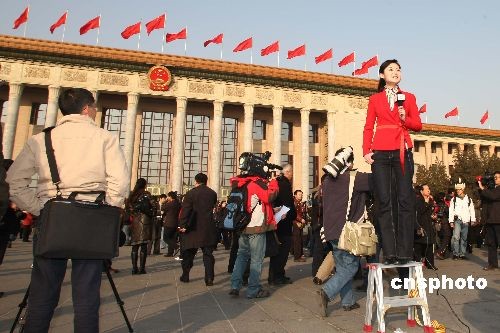 圖:女記者登高報(bào)道人大一次會(huì)議