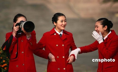 三月十日上午,十一屆全國人大一次會議在北京人民大會堂舉行第三次全體會議,三名兩會女服務人員在會場外好奇試用攝影記者的重“武器”。中新社發(fā) 盛佳鵬 攝