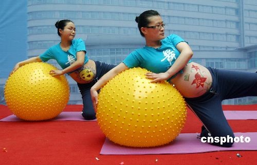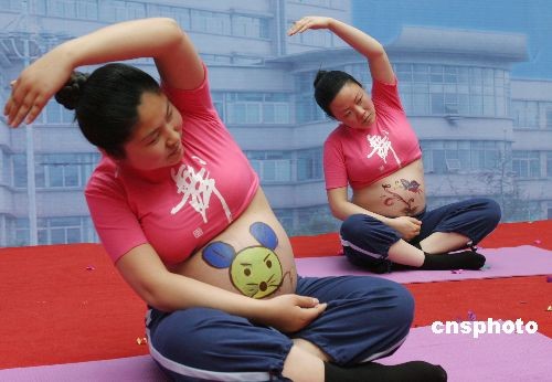 3月15日,眾多準(zhǔn)媽媽和在江蘇連云港市第一人民醫(yī)院展示母子康樂(lè)保健帶來(lái)的樂(lè)趣。經(jīng)過(guò)孕婦學(xué)校、孕媽咪沙龍、體功訓(xùn)練等孕前培訓(xùn)的準(zhǔn)媽媽大膽地在舞臺(tái)上舞動(dòng)身姿表演孕前保健操。中新社發(fā) 王健民 攝