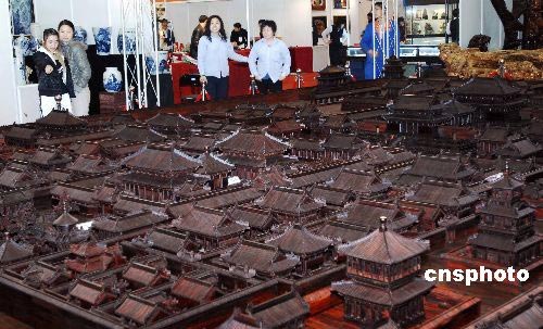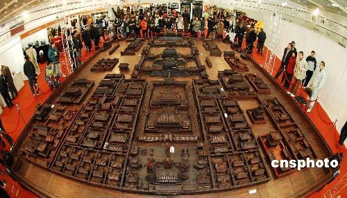 3月20日,為期5天的“第六屆全國工藝品、旅游品、禮品博覽會暨第十一屆春季(大連)中國古玩藝術品博覽會”在大連星海會展中心舉行。在展會西廳區(qū),一個一展現(xiàn)古都風貌喜迎2008年奧運會為創(chuàng)作宗旨的按正式比例縮小120倍的紫檀巨雕故宮全景,吸引了眾多市民的眼球。這個作品9米長,寬7米,總面積60余平方米,由50余位高級技師歷時6年精心雕制而成。該作品無論從用料、耗時都令人稱絕。如此大型紫檀木雕藝術作品也實屬罕見。中新社發(fā) 劉德斌 攝