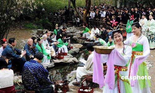 4月8日上午,中日韓書法家在書圣王羲之的浙江紹興蘭亭交流書藝、進(jìn)行曲水流觴飲酒作詩仿古雅趣活動。當(dāng)日,第24屆中國蘭亭書法節(jié)在浙江紹興舉行。來自中國、日本、韓國的42位書法家及數(shù)百名書法愛好者參加書法盛宴。中新社發(fā) 袁云 攝