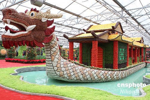 4月20日,一條名為“九船載福”的龍船在中國(壽光)國際蔬菜科技博覽會(huì)中展出,其高4.4米、長31米,共用花生果1.6萬顆,各種菜豆類種子2萬余粒,南瓜3.2噸,西紅柿鮮果4千公斤,朝天椒盆栽680盆,船體鑲嵌貝殼29萬片,各色菜苗1.6萬株,由29名工匠耗時(shí)4個(gè)月建成。本屆菜博會(huì)在山東壽光舉辦,主題是“現(xiàn)代·科技·希望”,展區(qū)面積達(dá)35萬平方米,擁有13個(gè)展廳,2000多品種,200多個(gè)蔬菜景點(diǎn)景觀。中新社發(fā) 趙雋 攝