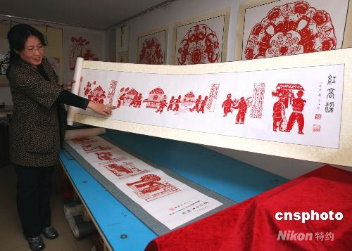 4月22日,山東高密市剪紙高人鄧輝講解她根據高密籍作家莫言小說《紅高粱》故事情節(jié)創(chuàng)作的剪紙作品。作為“中國民間藝術之鄉(xiāng)”的高密,是晏嬰、鄭玄、劉墉“三賢”的故鄉(xiāng),高密茂腔、撲灰年畫、聶家莊泥塑、高密剪紙“四寶”,已被列入國家級非物質文化遺產保護名錄。 中新社發(fā) 趙雋 攝