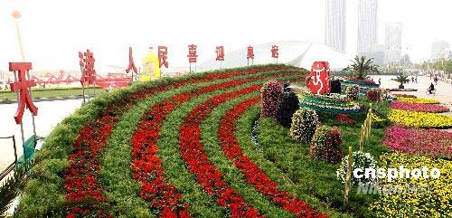 4月30日,天津市有關部門在銀河廣場擺放的以“天津人民喜迎奧運”為主題的巨型花壇亮相,使銀河廣場更靚,給即將到來的“五一”節(jié)增添了歡樂、祥和和喜慶氣氛。中新社發(fā) 李勝利 攝