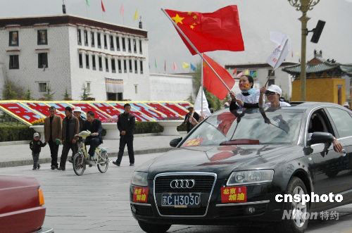 圖:網(wǎng)友自發(fā)組織的奧運(yùn)助威車隊駛過拉薩布達(dá)拉宮